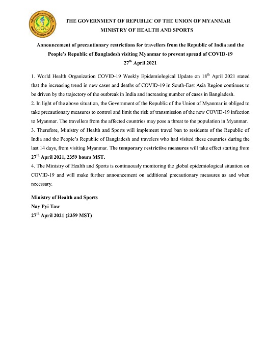 Announcement of Precautionary Restrictions For Travellers From The Republic of India And The People's Republic of Bangladesh Visiting Myanmar To Prevent Spread of COVID-19 (news on 28-April-2021)