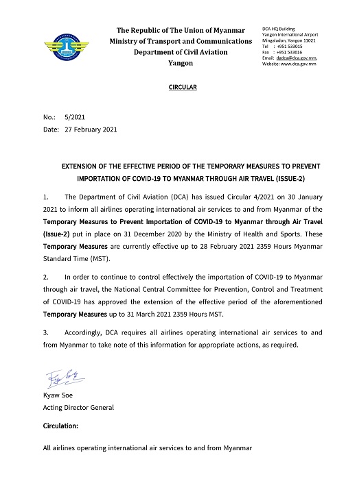Further Extension Effective Period of Temporary Measures To Prevent Importation of COVID-19 To Myanmar Through Air Travel (news on 27-Feb-2021)